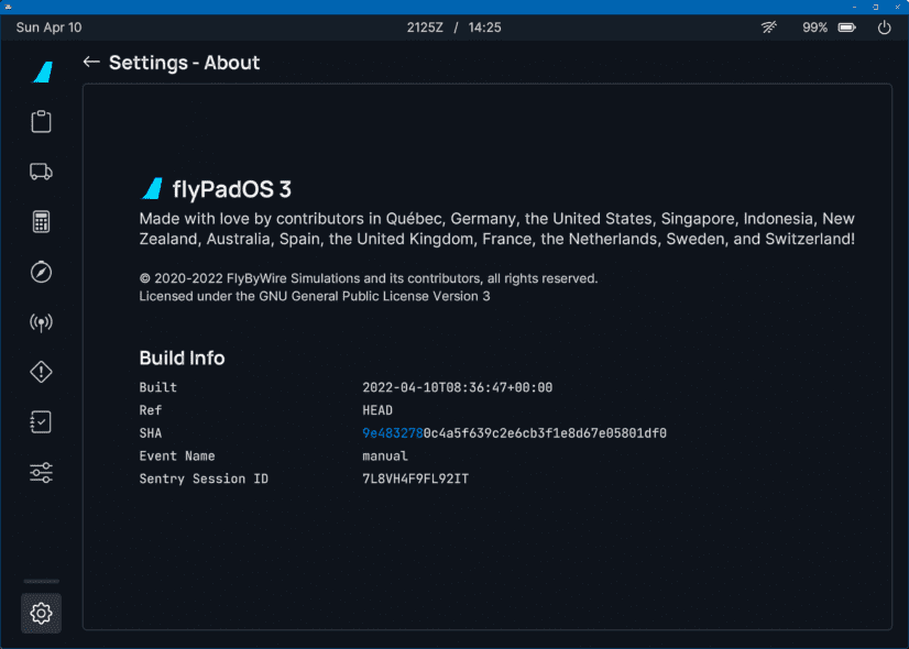The About page provides the build information which is sometimes requested when seeking support on the FlyByWire Discord.