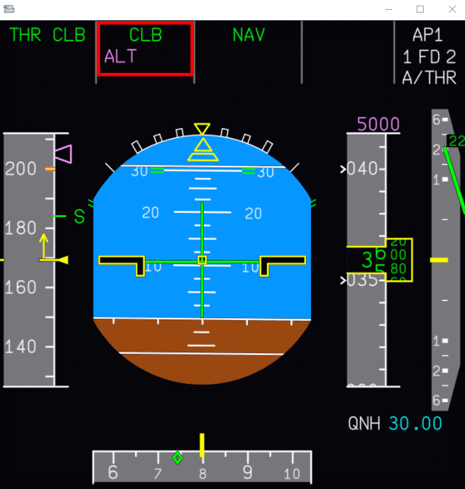 - The cyan arrow indicates that CLB is armed, and the AP will continue climbing above 5000 ft at