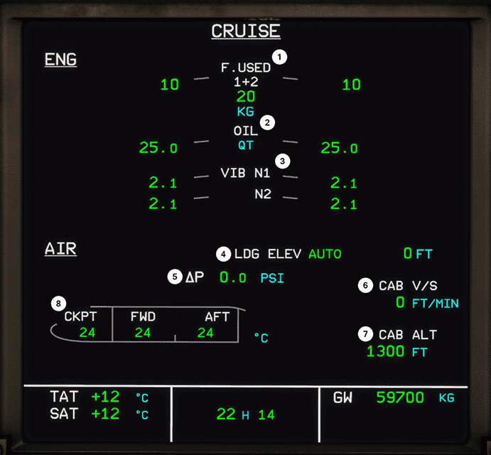 | 5 | Cabin Differential Pressure | Green ∆P | Appears green when normal. Pulses green when ∆P >= 1.5 psi before landing. |