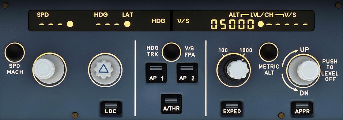 - Manual selection of flight parameters SPD, MACH, ALT, VSPD, HDG or track.