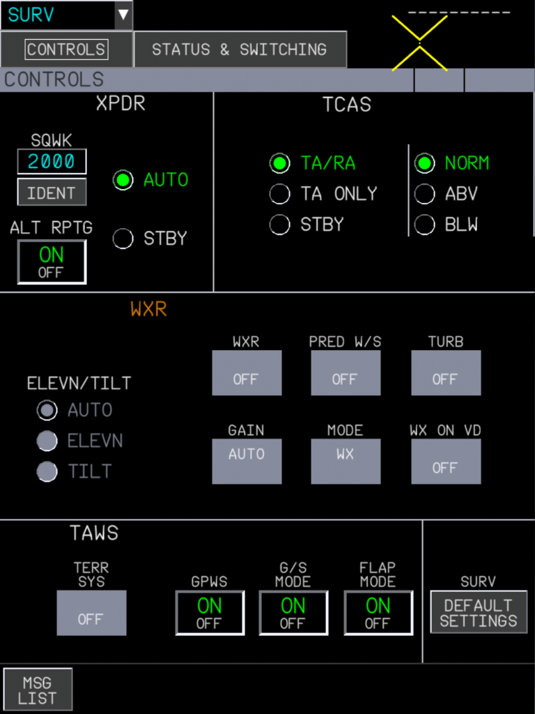 Verify on the Multi-Function Display (MFD) Surveillance page that the transponder is set to AUTO, the squawk code is as per ATC, the TCAS is set to TA/RA and Norm, all TAWS modes are ON, and the weather radar is set to AUTO, the elevation/tilt to AUTO, Mode set to WX, TURB set to AUTO, GAIN set to AUTO, WX ON VD set to ON and PRED W/S to AUTO)