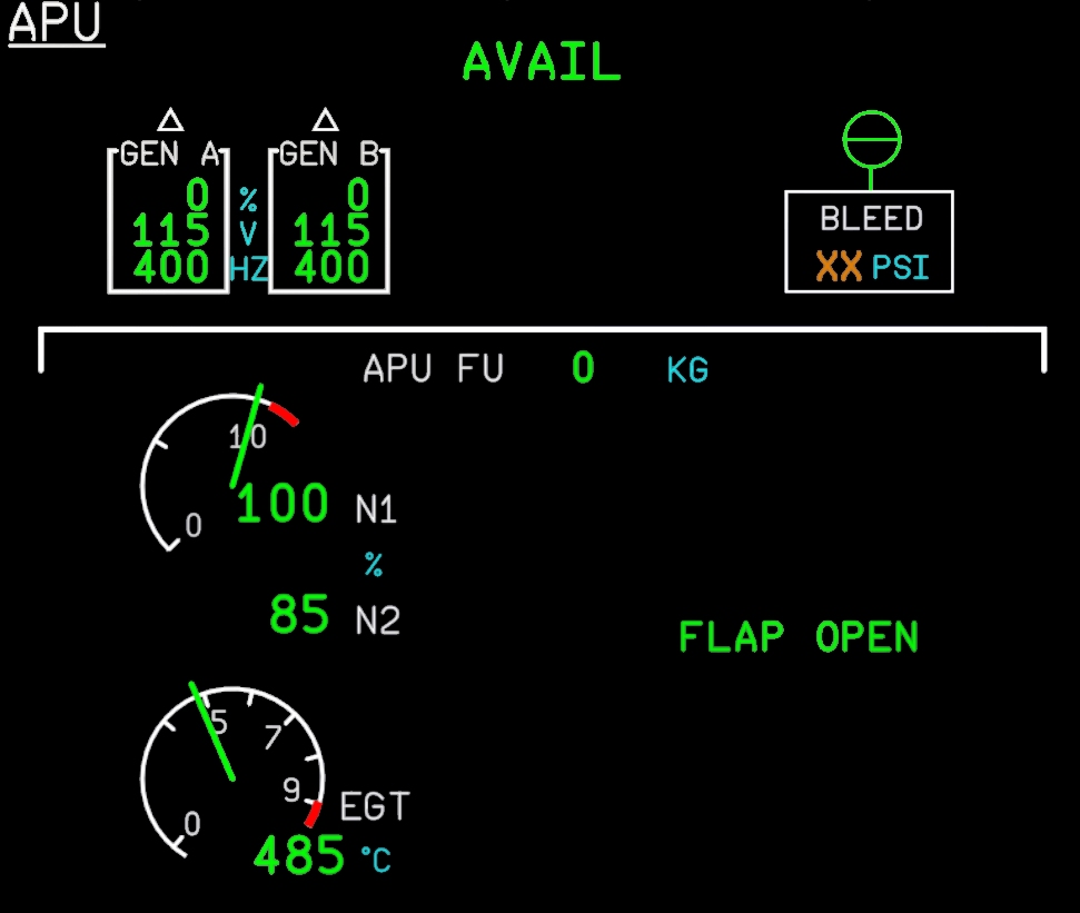 You can monitor the APU start on the SD APU page which comes up automatically when the APU is started. Once the APU is running, the APU page will show switch back to the previous page.